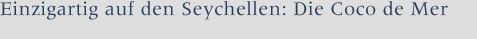 Die „Coco de Mer“ ist nicht nur eine biologische Sensation und das bekannteste Souvenir der Seychellen, sondern auch eine der schönsten und majestätischsten Pflanzen, die es auf der Erde gibt. Ihre Heimat liegt auf den kleinen Nachbarinseln von Mahé, Praslin und Curieuse. Bei der Meereskokosnuss handelt es sich um eine hohe, schlanke Palme mit einem extrem geraden und glatten Stamm, riesigen fächerförmigen Blättern und großen, schweren, herzförmigen Nüssen. Von diesem Baum gibt es männliche und weibliche Exemplare, die meist nebeneinander stehen. Die männlichen Bäume sind etwa fünf Meter höher als die weiblichen. Kurioserweise hat die männliche Palme ihre Pollen in einem Organ, das einem riesigen Phallus ähnelt, während die Frucht, die man an den weiblichen Bäumen findet, auch ohne viel Phantasie einem weiblichen Becken gleicht. Auf den Seychellen geht daher die Legende um, dass die Coco de Mer-Palmen sich in stürmischen Nächten vereinigten und so die Kinder und die neuen Kokosnüsse gezeugt würden. Wenn es ein Mensch wage, diese Begegnungen der Palmen zu beobachten, so müsse er sterben. Die wissenschaftliche Wahrheit der Vermehrung sieht etwas anders aus: Die Pollen der männlichen Palme werden durch den Wind zum weiblichen Baum hinübergetragen.